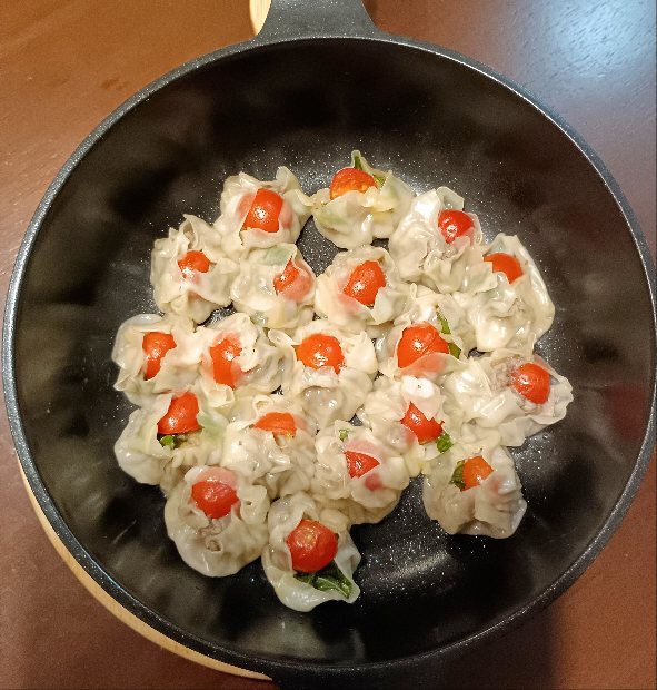 ひき肉に、モッツァレラチーズ、アンチョビ、バジルを刻み入れ、餃子の皮で包み、ミニトマトが頭を飾ります。